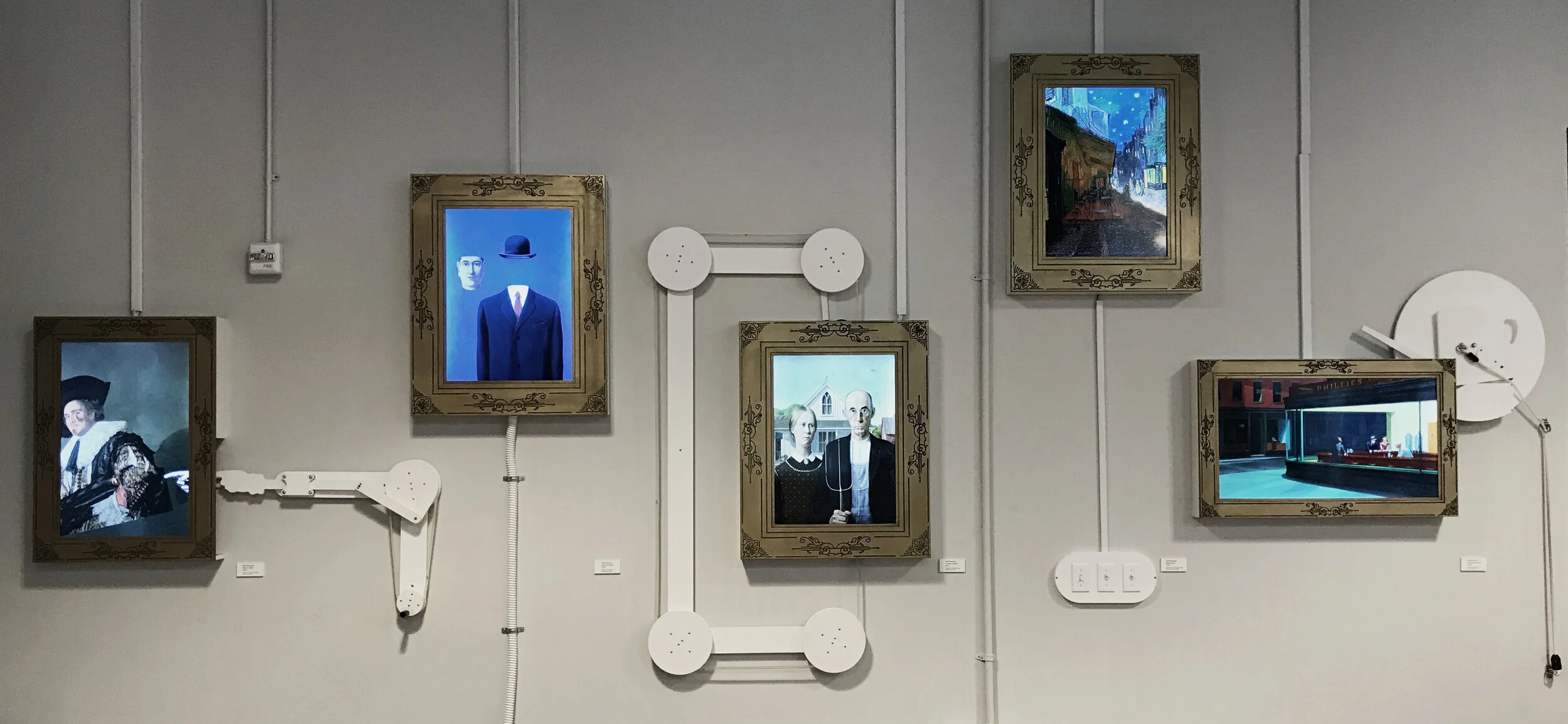 Mechanical Masterpieces is a collection of paintings reimagined for the 21st century. Optimised for a short attention span, it allows viewers to poke, prod, change, uncover, swell and water the paintings as they please. The installation was created by Neil Mendoza for the Children's Museum of Pittsburgh.